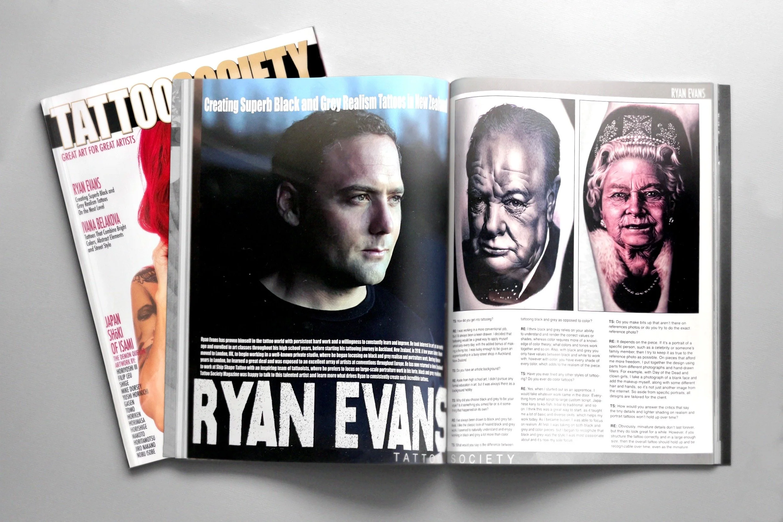 Ryan Evans - a play of light and shadow. Four page spread covering Q&A profile with Ryan Evans in Tattoo Fest magazine, Poland.